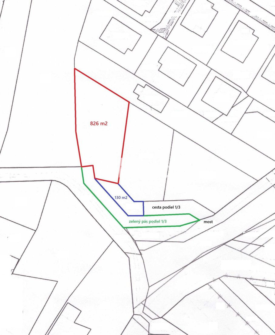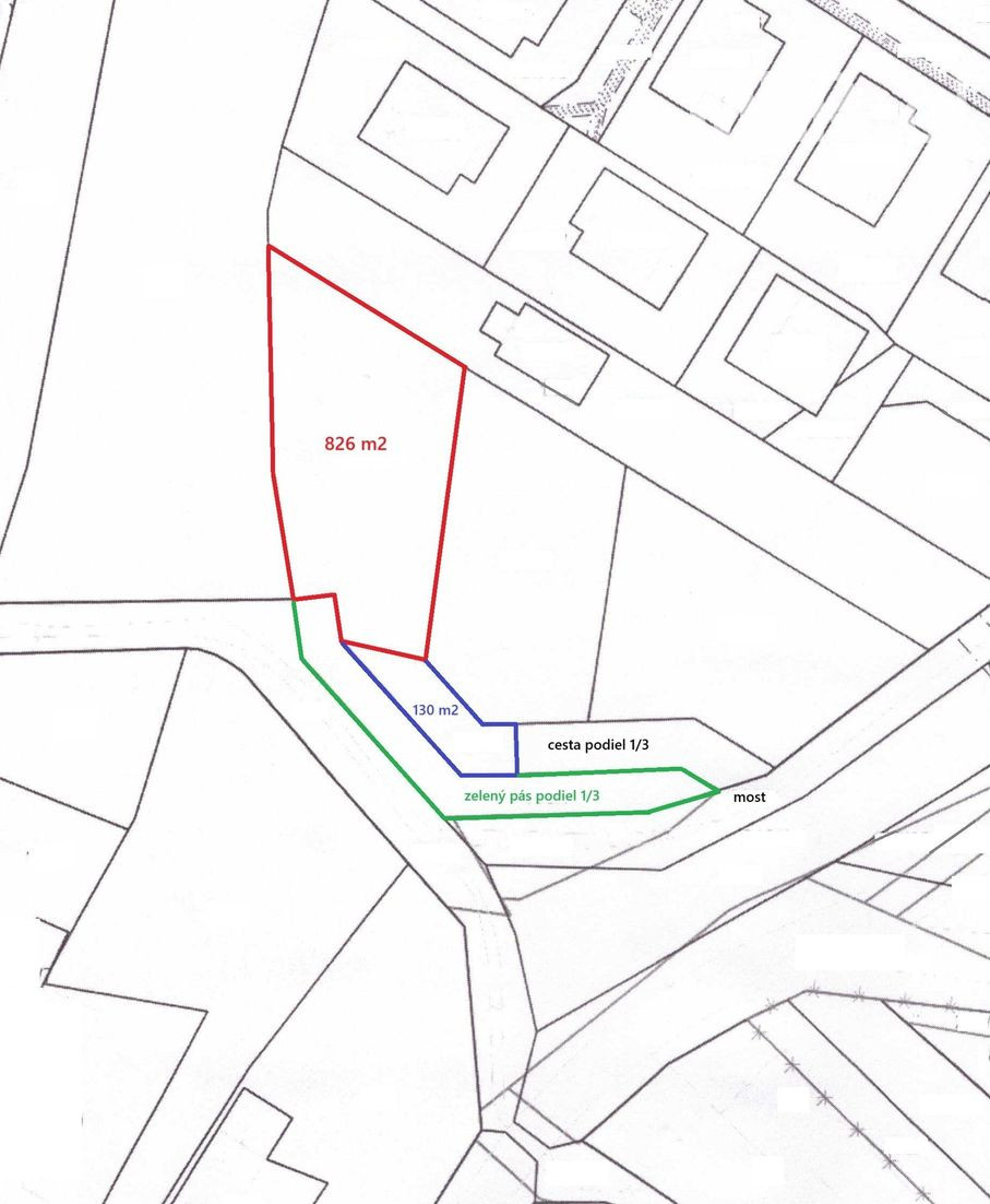 Cena zahŕňa: pozemok 826 m2 + 130 m2 a podiel na spoločnej prístupovej ceste vrátane mosta.