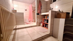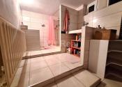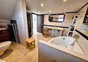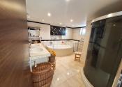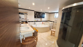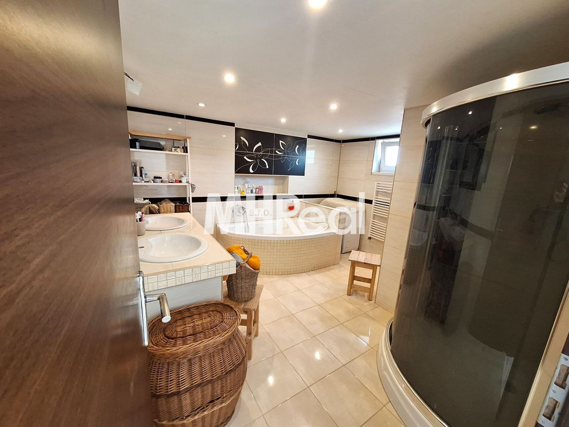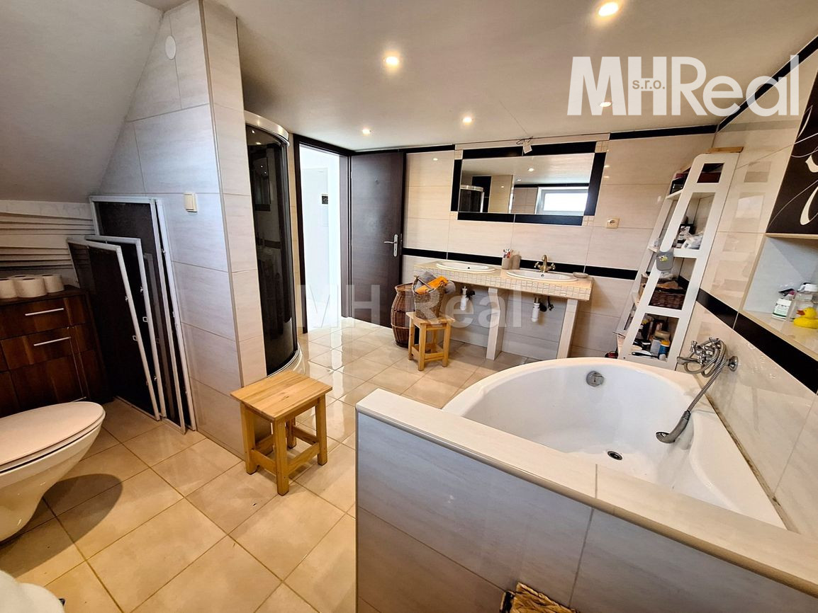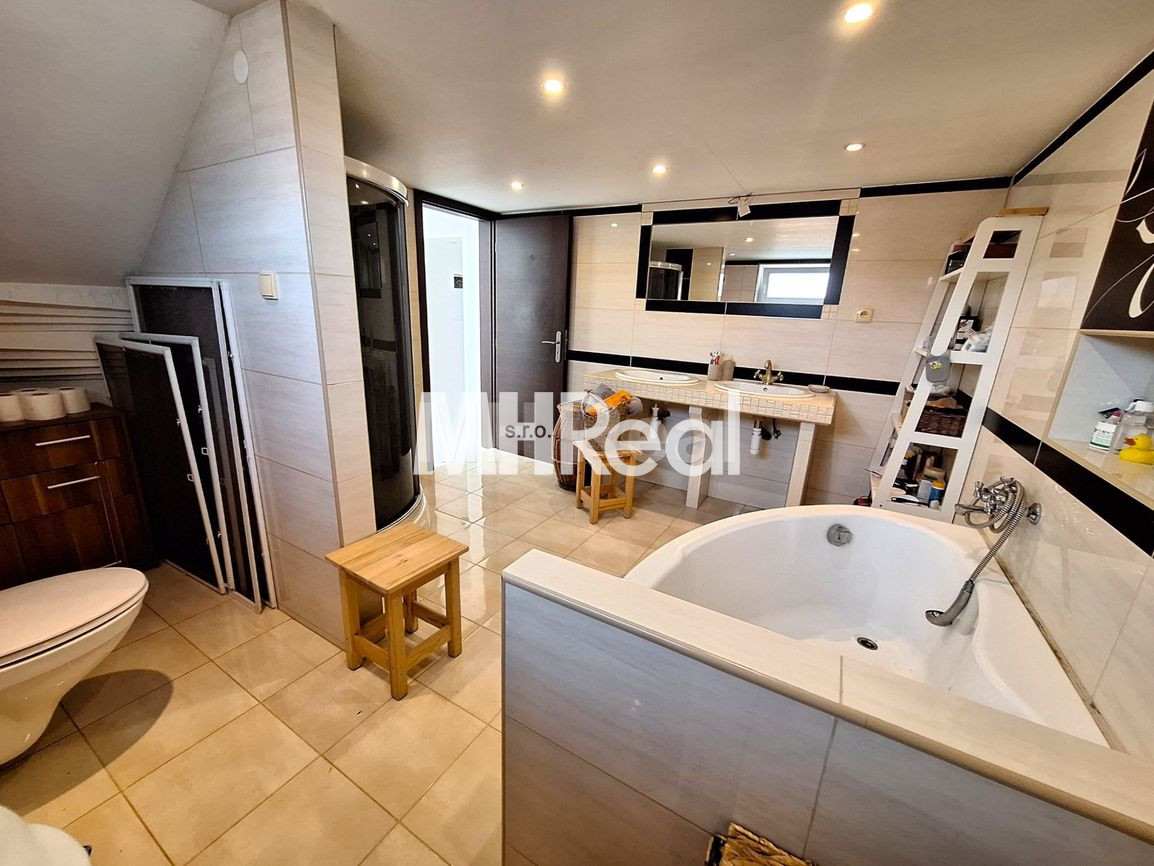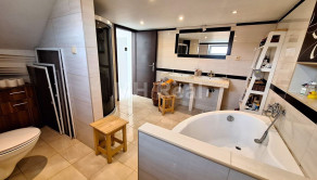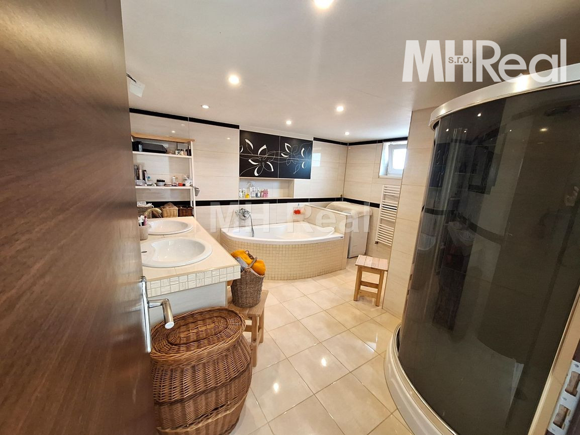 Kúpeľňa sa nachádza na medziposchodí: rohová vaňa, sprchovací kút, 2 x umývadlo, kúpeľňový nábytok, WC.